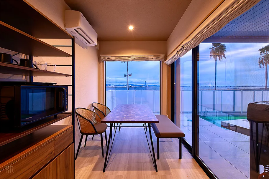 大きな窓からはプールと海を一望できるダイニングスペースも設計。リゾート気分を感じながら食事を楽しめる空間をご用意。