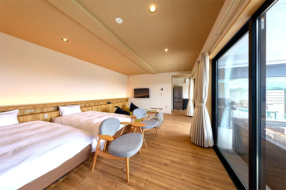 大きな窓から自然光が差し込み、プールサイドの景色を眺めながらゆったりとくつろげる設計に。