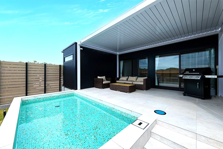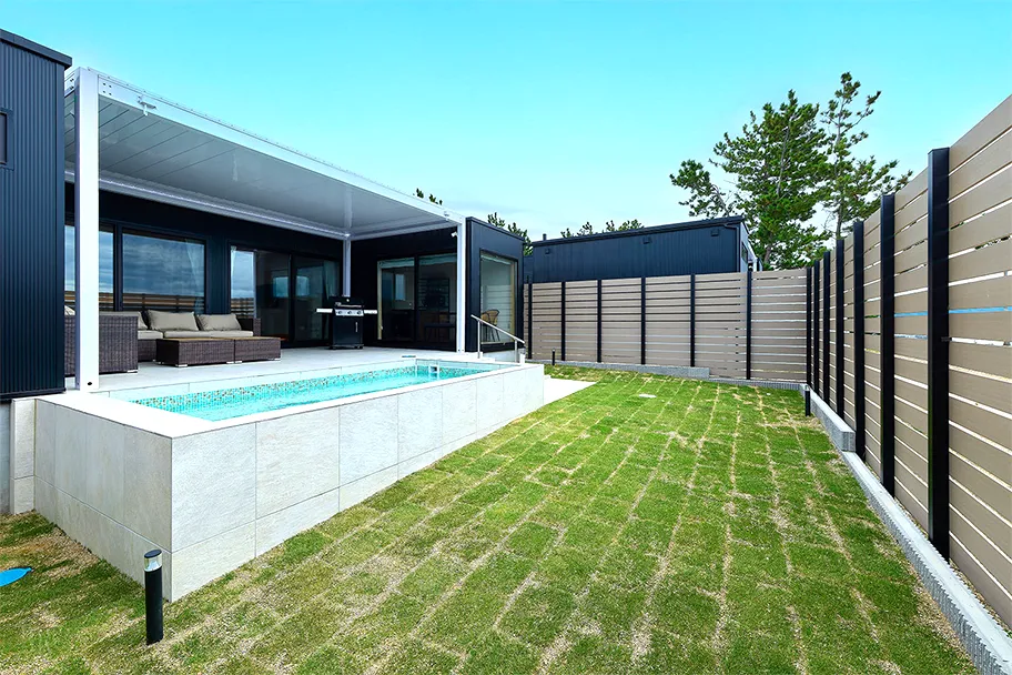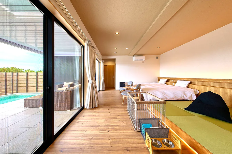 専用のドッグランとワンちゃんと一緒に楽しめるプライベートプールを完備。オーシャンビューの非日常を満喫できる空間として設計された宿泊棟を納品いたしました。