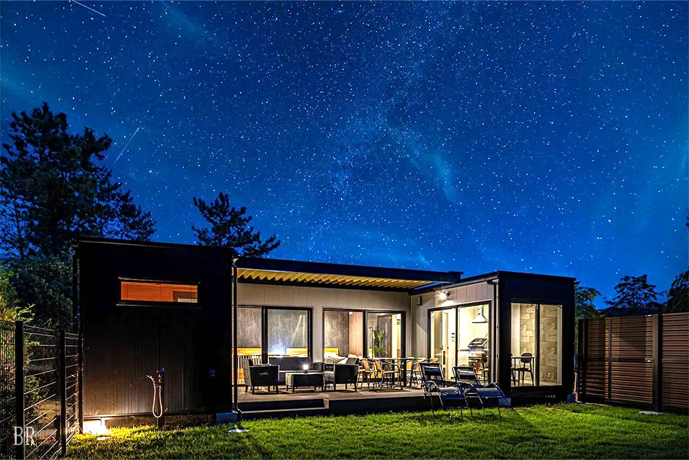こちらが完成写真です。とても美しい調和のとれた環境の出来上がりです。お施主様の今後の良い貸別荘経営に当社のユニットハウスがお役立ちできることは大変光栄です。
