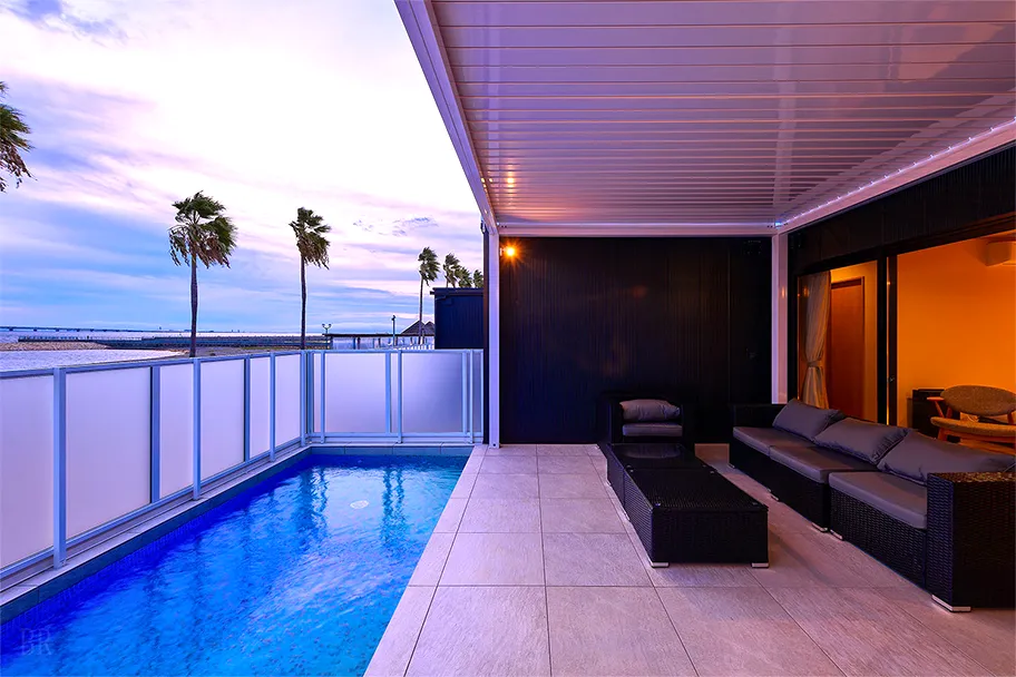 ブルーのプールの底に水を張れば水面が輝いてとてもいい雰囲気に、コンセプトが定まっているこの貸別荘ならリゾート施設にいるような体験をすることができます。今回設置させて頂いたサウナはこの貸別荘におきな付加価値を生んでいます。
